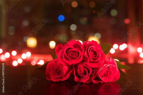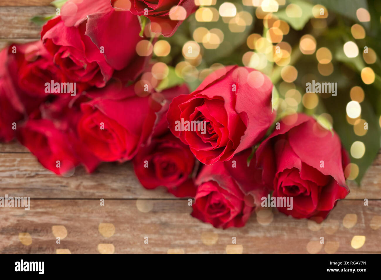 Close Up Of Red Roses Bunch Over Festive Lights Stock Photo