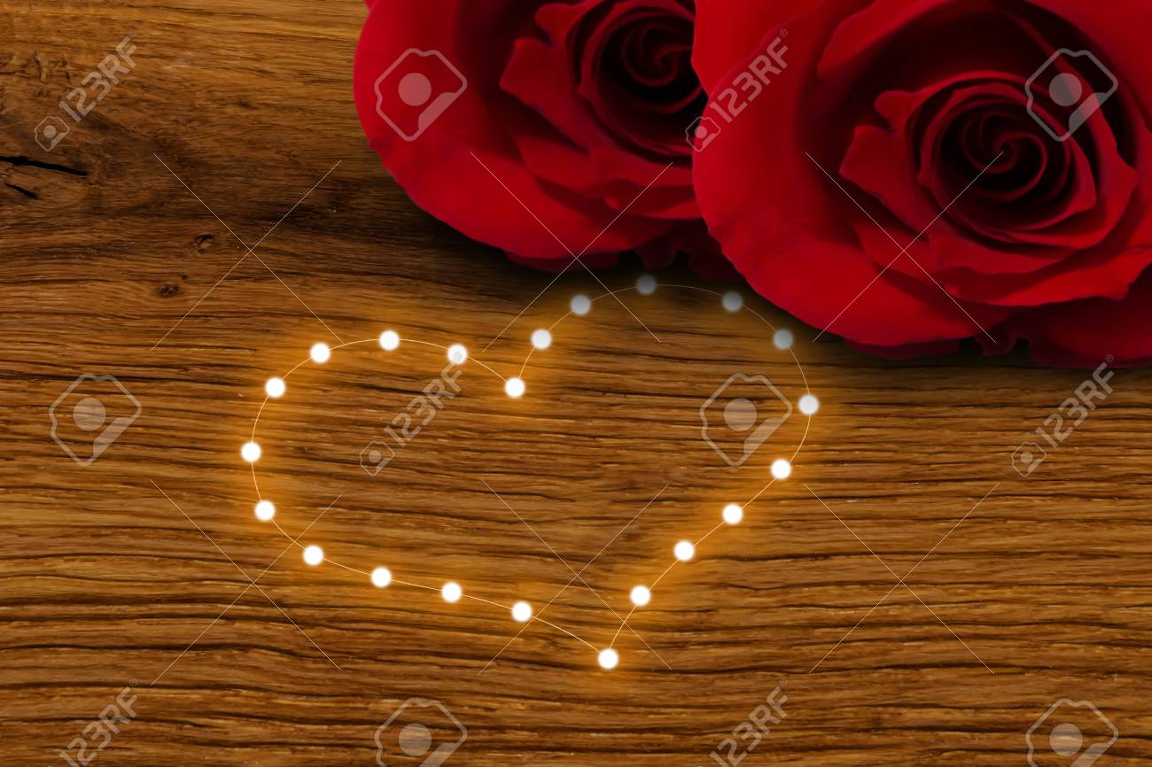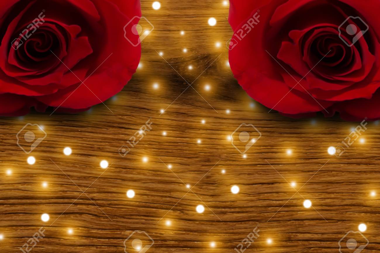 Valentines Day Red Roses Lights On Old Rustic Wood Table